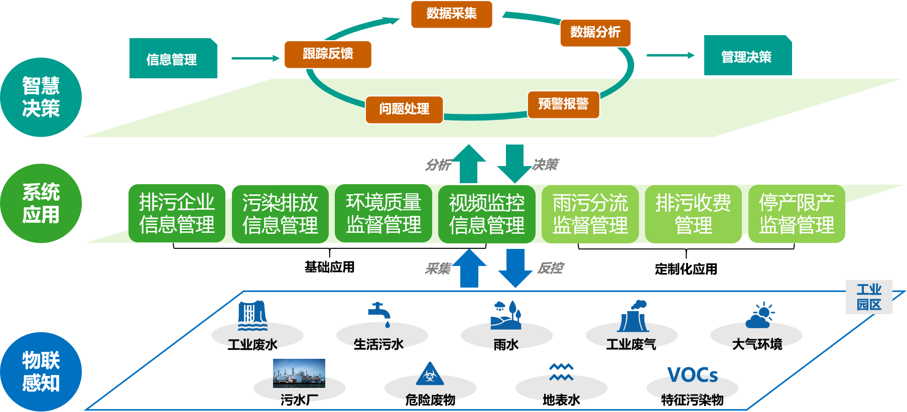 智慧園區(qū)綜合監(jiān)管系統(tǒng)集園區(qū)河涌監(jiān)管、廢水排放監(jiān)管、雨污分流監(jiān)管、園區(qū)大氣管理、廢氣排放監(jiān)管、危廢監(jiān)管等于一體,通過(guò)前端在線監(jiān)測(cè)儀表實(shí)時(shí)監(jiān)測(cè)水質(zhì)、大氣和固廢情況,從“安全、環(huán)保、安防、能源”等方面實(shí)現(xiàn)智慧化應(yīng)用,實(shí)時(shí)展示在線監(jiān)測(cè)數(shù)據(jù)、分析、預(yù)警、溯源等,及時(shí)掌控園區(qū)水環(huán)境、大氣環(huán)境、固體廢物的綜合情況,預(yù)警重大污染事故,為園區(qū)日常運(yùn)營(yíng)和智慧管理提供科學(xué)決策支撐。